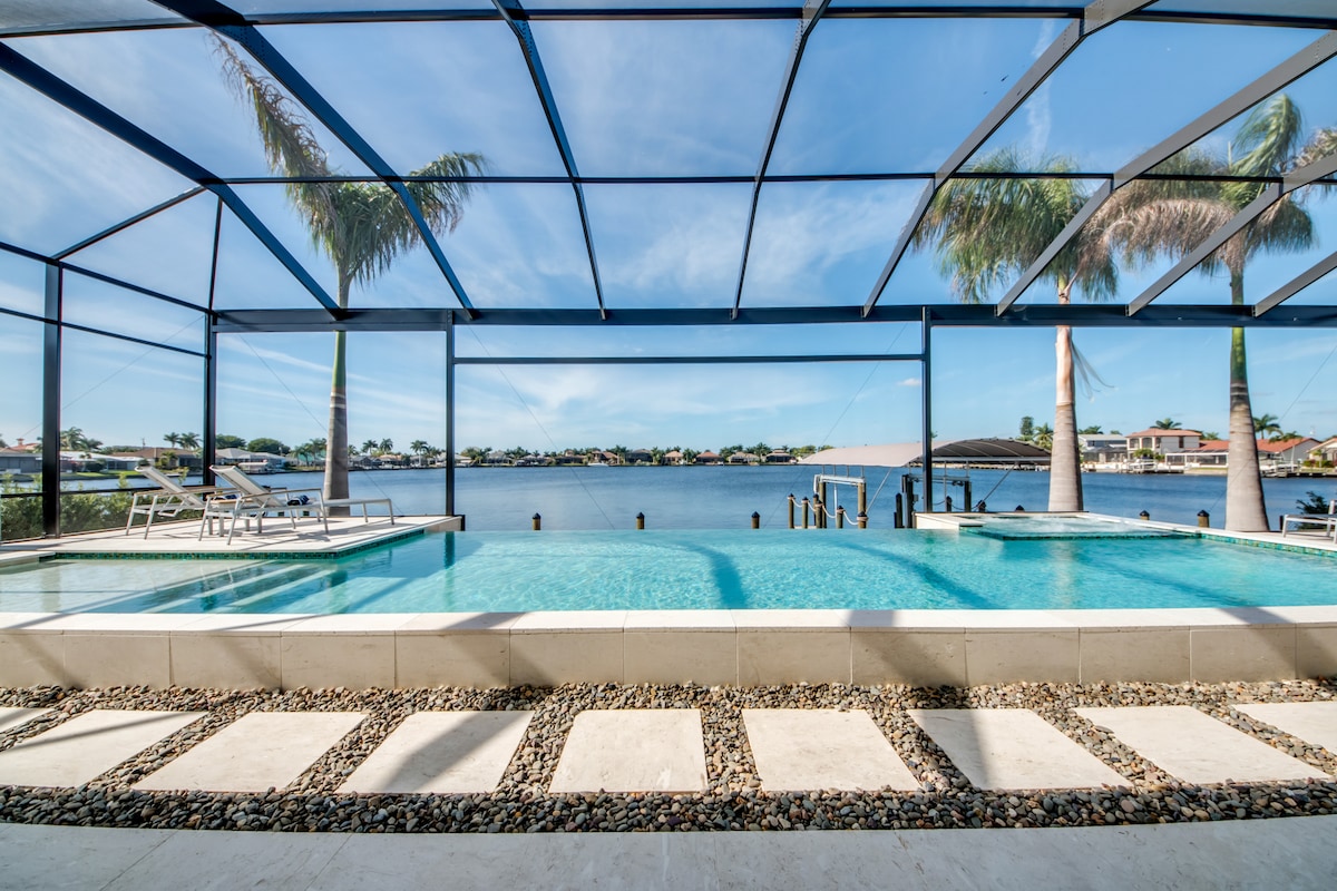 UNO DEI MIGLIORI LUNGOMARE DI CAPE CORAL! A pochi passi dalla spiaggia. Questa casa di oltre 230 metri quadri offre splendidi tramonti e viste sull'acqua a sud-ovest da tutte le principali aree giorno, nonché dalla suite padronale. Piscina riscaldata con illuminazione a LED colorata, spa integrata, bagno in piscina, lavanderia completa, Lanai, camino, Wi-Fi e TV in ogni camera da letto, molo privato. Barca su sollevatore in affitto con RPM Rentals. Ampio garage per 2 auto con 5 biciclette, carrello da spiaggia e frigorifero in loco.