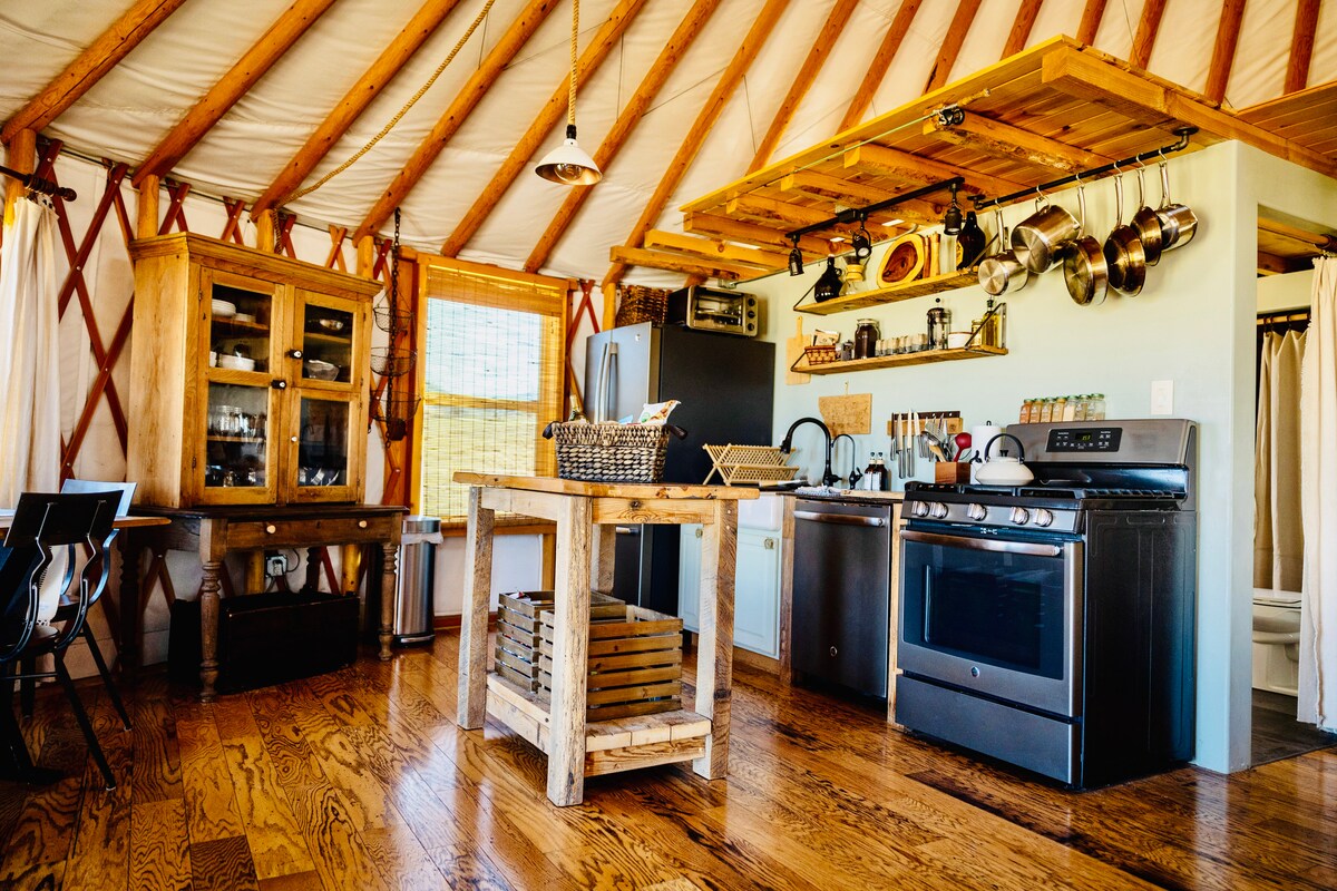 Allontanati da tutto e dormi sotto una coltre di stelle a Wild+Wander. Questa yurta luminosa di 9 metri offre tutti i comfort di una casa, permettendoti di fuggire dalla quotidianità. Rifugio perfetto per coppie, questa yurta dispone di cucina completa, camera da letto e bagno, vasca idromassaggio, stufa e fascino che non puoi trovare altrove. Immersa nelle colline, la yurta si trova su 5 ettari di terreno con vista panoramica sulle montagne. Al riparo dal rumore e dalle luci della città, ma a soli 20 minuti dalla strada principale, questa proprietà è un santuario nascosto.