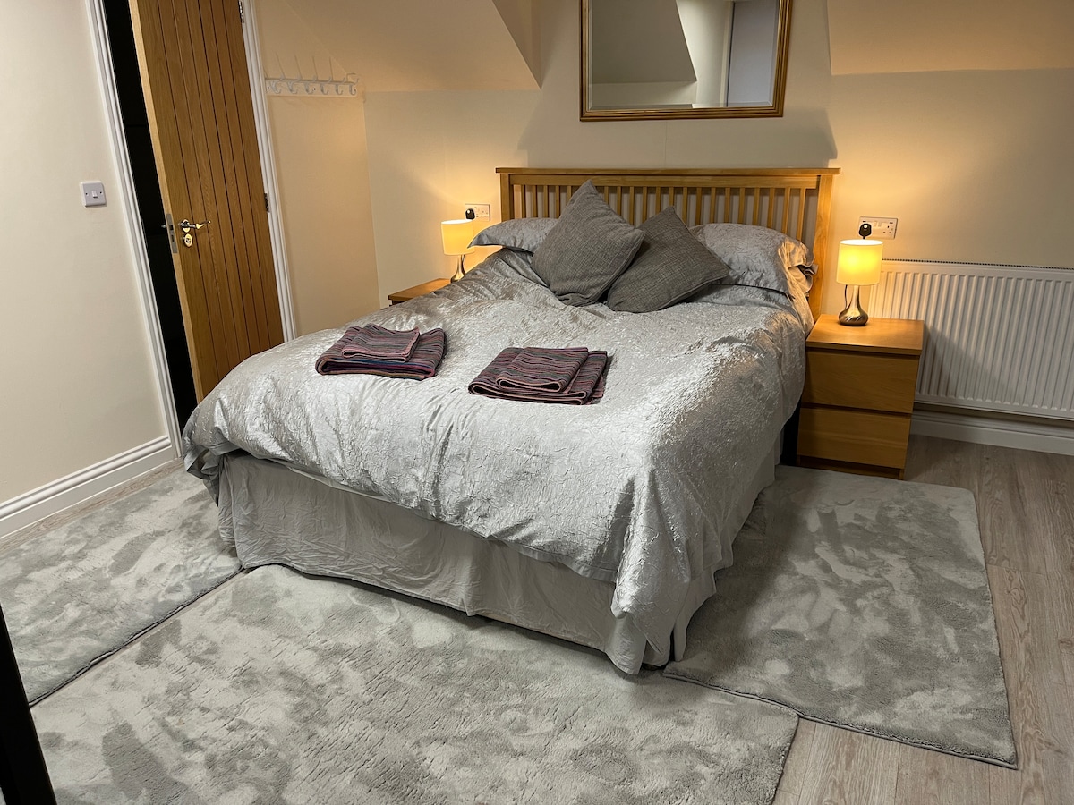 L'appartamento è annesso alla nostra casa sopra il garage, con porta d'ingresso privata, ampio spazio con letto king size John Lewis e bagno privato. Costruito nel 2016, così bello e caldo. La cucina è dotata di frigorifero, congelatore, forno a microonde, bollitore, tostapane, lavatrice, forno e piano cottura Sky TV, Disney, Netflix, Wi-Fi 300mb+, scrivania. Se prenotato con 2 giorni di anticipo, forniamo cereali, pane, burro, latte, tè e caffè. Il parcheggio è privato e si trova accanto alla porta d'ingresso, con ricarica per veicoli elettrici disponibile. Possiamo aggiungere un letto zed per £30