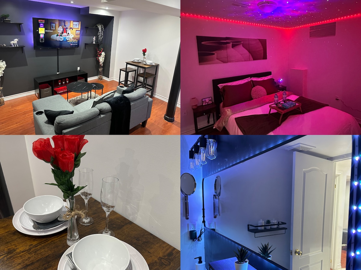 Goditi un soggiorno elegante e tranquillo in questo appartamento con una camera da letto al piano terra, situato in posizione centrale e perfetto sia per chi viaggia per piacere che per lavoro. Con ingresso indipendente, parcheggio e tutti i servizi essenziali, è la tua casa ideale lontano da casa. I servizi includono una cucina completa, un bagno, internet, una smart TV, un letto matrimoniale, un divano letto e uno spazio di lavoro funzionale. A pochi passi da FreshCo, Walmart, ristoranti e servizi. A pochi minuti da Vaughan Mills, Canada's Wonderland, dall'ospedale Cortellucci e dai mezzi pubblici.