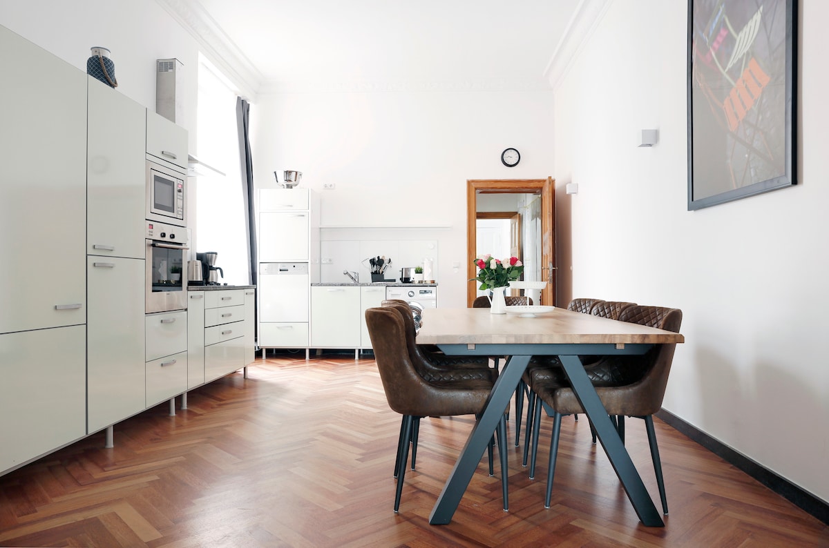 L'esclusivo appartamento nuovo dispone di 2 camere (75 m²) ed è vicino al centro, in un quartiere interessante e verde (con parco), nonché vicino a negozi alla moda, ristoranti e gallerie. Trasporti pubblici nelle vicinanze. Ampia cucina ben attrezzata con piano cottura a induzione, lavastoviglie, macchina da caffè Senseo, forno a microonde, lavatrice e asciugatrice, vasca da bagno, soffitto alto 3 metri, TV LCD, impianto audio Bose, per 4 persone. (I neonati non vengono conteggiati, i bambini di età superiore ai 2 anni contano come persone). (Prenotazione aggiuntiva: posto auto sotterraneo).