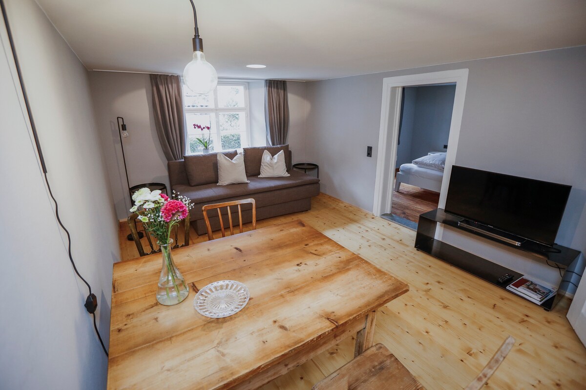 Grazioso appartamento con 2 camere da letto, cucina e soggiorno. Evidenzia è il grande balcone coperto dove si può anche dormire meravigliosamente. Oltre ai circa 70 m2 di questo appartamento, l'intera infrastruttura della casa di montagna con area benessere, piscina, salone, sala chat e camera familiare e giardino è a vostra disposizione come casa.