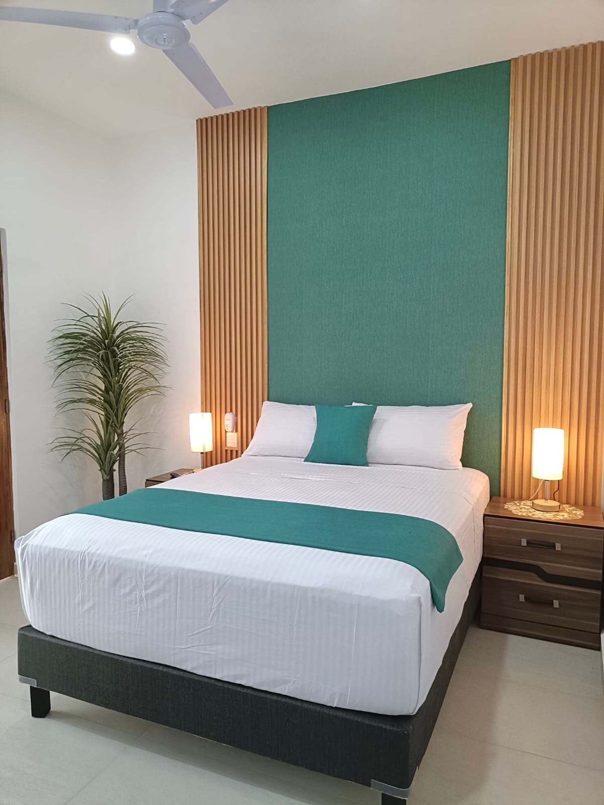 La camera matrimoniale si trova al piano terra e offre uno spazio confortevole, fresco e tranquillo, ideale per riposare o lavorare da remoto. Il suo design boho-tropicale crea un'atmosfera rilassante perfetta per un piacevole soggiorno. Dispone di due letti queen size, aria condizionata, ventilatore, TV, WiFi, bagno privato, minibar, macchina da caffè Nespresso e cucina bar. Come ospite puoi usufruire delle aree comuni come piscina, sala coworking, soggiorno, cucina attrezzata e circuito di sorveglianza.