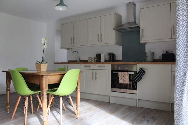 Monolocale privato indipendente, con vialetto privato e mini giardino. Bagno moderno con doccia, pavimenti in legno, stufa, forno e TV. Nel bellissimo villaggio di Mells, a 5 minuti in auto da Babington House e a 20 minuti da Bruton. Perfetto per soggiorni romantici e tranquilli. Esclusiva suite da letto luminosa e ariosa con enorme finestra panoramica per osservare le stelle di notte e godere della vista sul giardino/fiume durante il giorno. Una notte di sonno perfetta (letto king-size) garantita! Tende oscuranti e in lino. Accogliente salotto open space per Netflix (grande divano ad angolo) e cucina completamente attrezzata