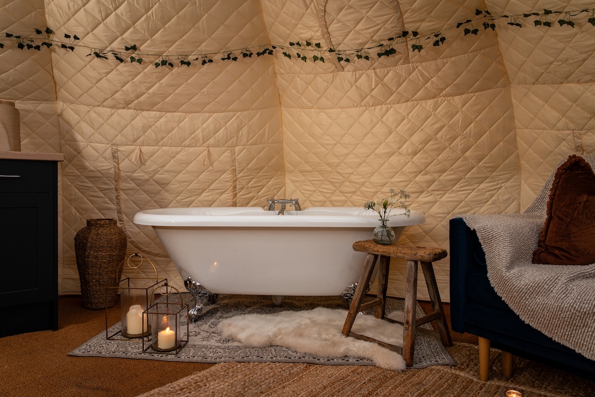 Goditi un'esperienza indimenticabile, nascosta in un prato privato circondato da 17 ettari di giardini di fama mondiale. Riservata solo a 2 adulti, la tenda a campana è progettata per un comfort semplice ma lussuoso, con un letto matrimoniale grande, mobili in legno su misura e comode sedute. C'è una stufa a legna per trascorrere serate accoglienti e tutto il necessario per preparare un pasto per due. C'è anche un focolare per serate tranquille, per ammirare le fiamme e fare barbecue.