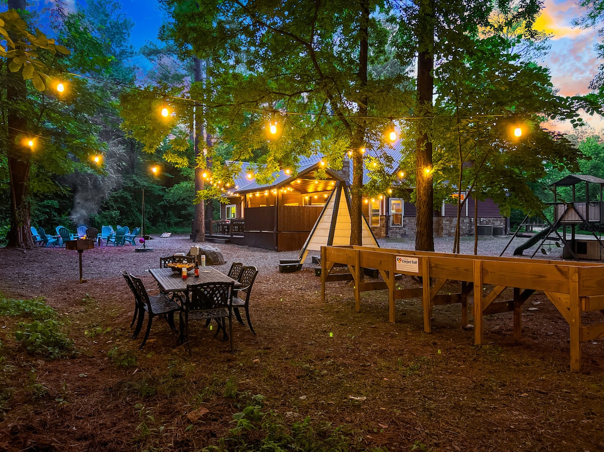 Lusso nella natura selvaggia a Broken Spoke! Ideale per coppie o famiglie, questo chalet offre spazi aperti e comfort. La grande stanza è piena di fascino country, con un camino in pietra e ampi posti a sedere. Rilassati nelle confortevoli suite con letto king-size. Preparare i pasti è un gioco da ragazzi, grazie alla cucina attrezzata o ai ristoranti nelle vicinanze. Goditi la vasca idromassaggio privata coperta, i focolari e il campo da gioco del ferro di cavallo. I bambini adorano il parco giochi e tutti apprezzano la breve distanza in auto dal Beaver's Bend Park e dal lago Broken Bow. Questo chalet NON è adatto agli animali domestici.