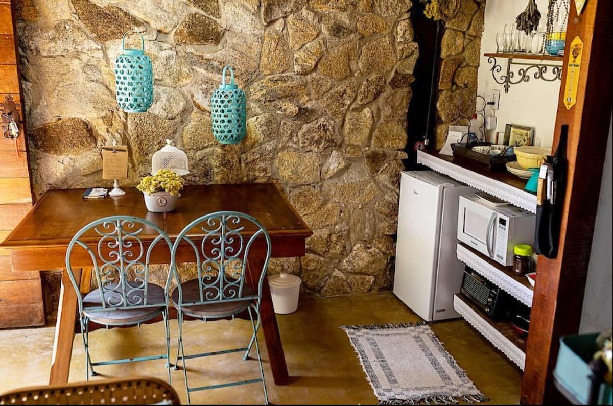 Bungalow con la migliore vista della Serra da Moeda, semplice e accogliente, unico alloggio sul terreno, con doccia riscaldata a gas, soffitto in legno, frigorifero, terrazza con pergolato coperto. Il ponte dispone di chaise longue, amache e tavolino per bere un bicchiere di vino guardando il tramonto o l'alba della luna piena. Cucina completa con fornelli e utensili, barbecue portatile. La Serra da Moeda si erge di fronte allo chalet. Sentitevi abbracciati dalla natura che circonda il luogo e vi invita a rilassarvi e godervi il momento!
