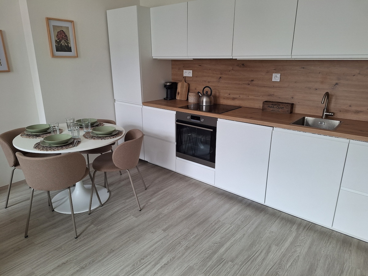 Byt se nachází v moderně zrekonstruovaném rezidenčním komplexu, který zajišťuje vysoký standard bydlení, a to přímo naproti obchodnímu centru. Byt je plně vybaven a nabízí veškerý komfort: ložnice s pohodlnou manželskou postelí, obývací pokoj s rozkládací sedačkou (s vestavnou matrací), která slouží jako další lůžko pro 2 osoby, TV, kuchyňský kout, koupelna. Ubytování je ideální pro páry a rodiny. Díky své poloze máte veškerou občanskou vybavenost na dosah – obchody, restaurace i zábavu.