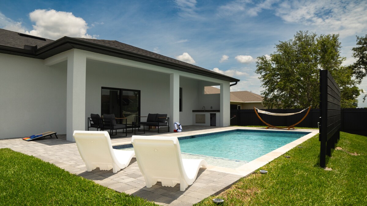 Goditi il mix perfetto di stile, comfort e valore nella soleggiata Cape Coral. Perché prenotare con noi? Incantevole casa di 186 m² A 30 minuti da spiagge, parchi e campi da golf Piscina privata riscaldata Palestra casalinga Sala giochi Wifi veloce Cucina attrezzata Scrivania da casa PARCHEGGIO GRATUITO in loco Barbecue e pranzo all'aperto Lavatrice e asciugatrice Per famiglie e bambini Teli da piscina inclusi Giochi da tavolo e di carte Facile self check-in Si accettano animali domestici. Cortile completamente recintato Spazioso cortile Quartiere tranquillo Moderno, di nuova costruzione