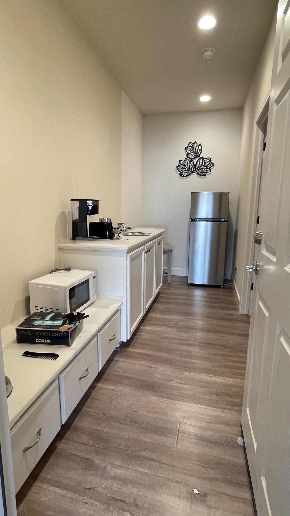 This space is a private entry 275 square foot small studio with a private bath, connected to the main house but with no access to the main house. The unit has a standard sized mini fridge, microwave and keurig coffee maker with coffees to choose from, a very mini toaster oven for one bagel or one piece of toast, lite snacks and waters for you. Also a small table and chair set, desk and a brand new queen sized bed, the location is great if you work at the lab or if visiting family in the area.