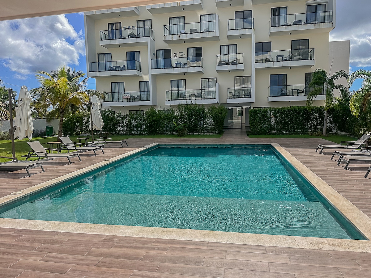Kick back and relax in this calm, stylish space. Studio style apartment with nice balcony facing the pool area. 10-15 minutes from Punta Cana Airport. Gym available in property. Outdoor siting by the pool. Situated in the center of Downtown Punta Cana, next to Coco Bongo, Hard Rock Cafe, Punta Cana Mall, Plaza San Juan, banks, movie theater, restaurants, supermarkets & shops. Designated parking on site. Gated access with 24/7 security.