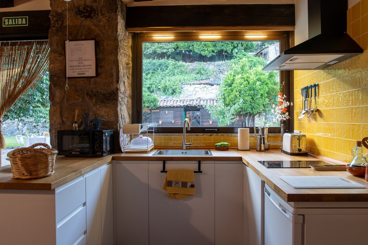 Agriturismo nella Valle Jerte, tre camere con letto matrimoniale e bagno singolo con doccia. La cucina è completamente fornita, inclusa una lavastoviglie. Il soggiorno ospita un caminetto a legna incluso. Giardino e barbecue. Wifi. Biancheria da letto e da bagno.