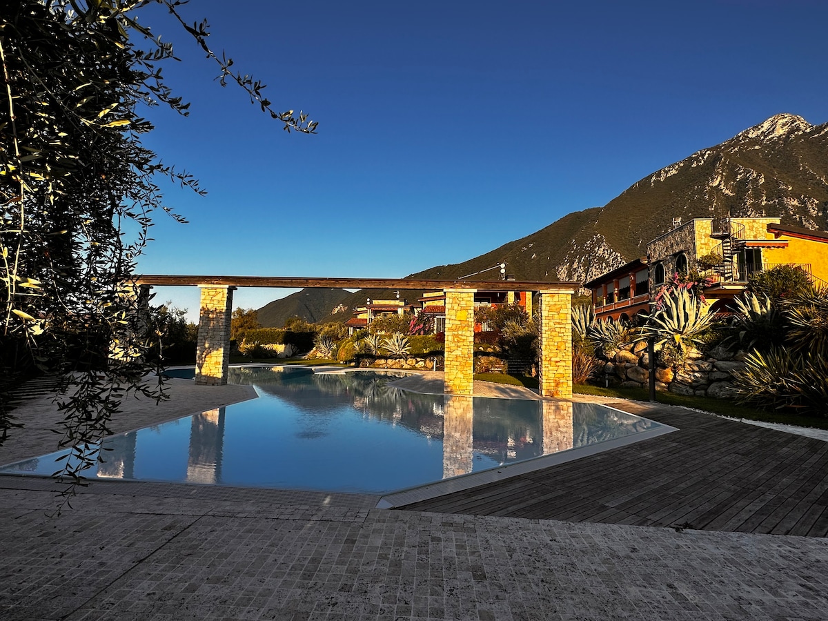 „Oasi Blu dell’oliveto“ bedeutet „Blaue Oase des Olivenhains“, denn sie liegt umgeben von Olivenhainen etwas oberhalb des Gardasees und bietet, selbst in der Hochsaison, eine Oase der Ruhe & Erholung. Der außergewöhnliche Pool, der an eine Limonaia erinnert, verfügt über einen sanft abfallenden Kleinkinder- und Schwimmerbereich, Erholungszonen mit Massagedüsen und Outdoordusche. Die ausladende, private und überdachte 40qm Terrasse mit Blick über den See garantiert Ihnen wunderbare Entspannung.