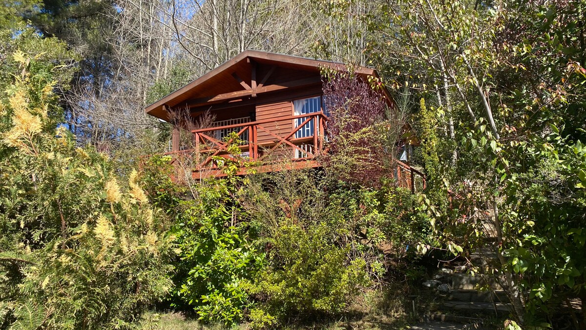The cabin has a natural feel and rustic touch within amazing surroundings of the native forest and trees all around you. The cabin has been built with native and sustainable wood. it is well equipped. Is very cute and cozy space with a large veranda with an outdoor seating. There is a nice river with access within the property with a picnic table next to it to enjoy listening the river. Big sunny green garden, picnic table to enjoy the view of the mountains, a fire-pit and couple of hammocks.
