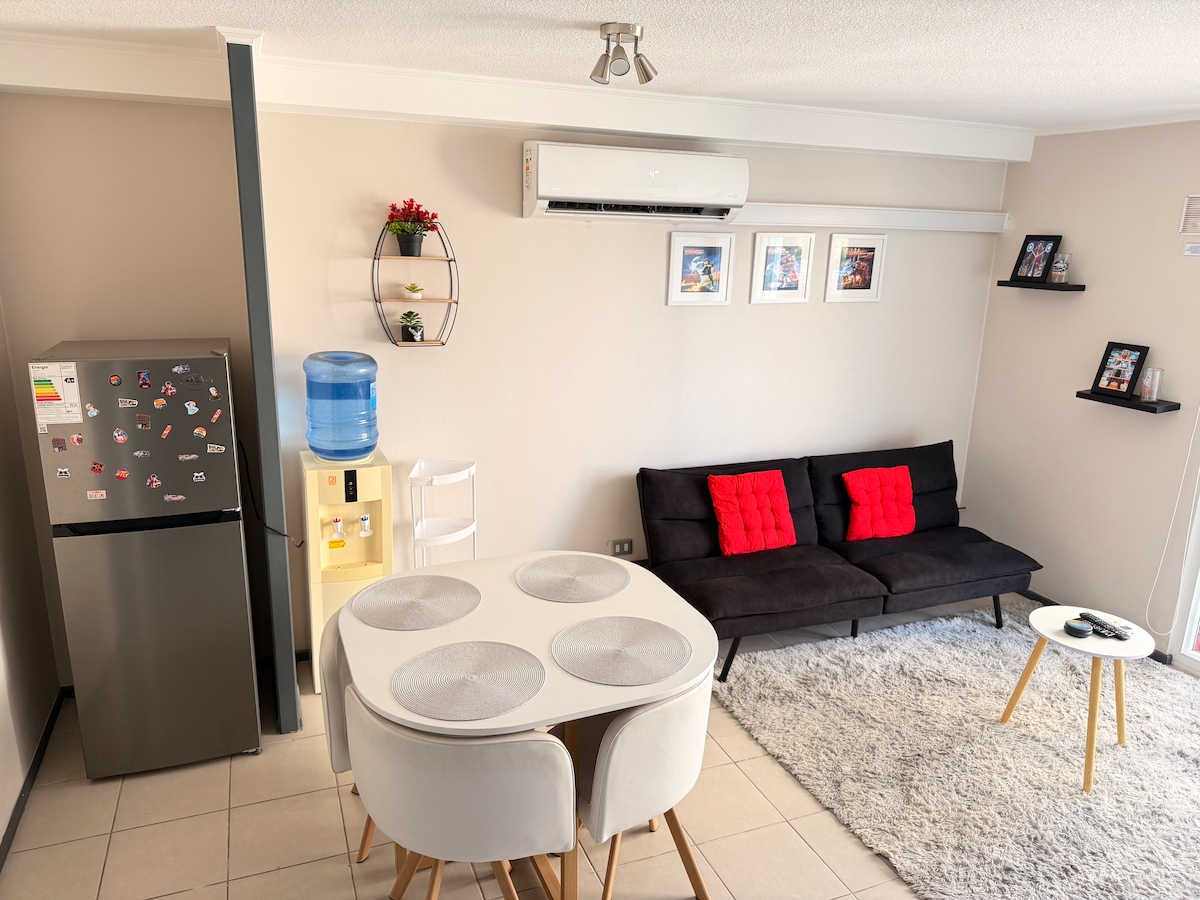Accogliente monolocale nel cuore di Rancagua Questo moderno monolocale è pensato per offrirti comfort e funzionalità. Tutto ciò di cui hai bisogno per due persone Cucina completamente attrezzata Area relax e intrattenimento Bagno ben attrezzato Posizione eccellente: A soli 5 minuti dal Terminal O'Higgins A 6 minuti dal terminal dei treni A 4 minuti a piedi dall'Università O'Higgins Facile accesso ai mezzi pubblici dalla strada