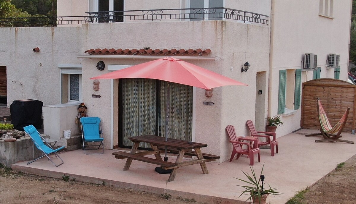 È a vostra disposizione un appartamento di 36 M2 e una terrazza di 15 M2 al piano terra adiacente a un altro appartamento separato da un muro l'accesso diretto alla baia si trova a 3 metri dalla terrazza tramite una scala. C'è un condizionatore reversibile per un vero comfort sia d'estate che d'inverno. Appartamento funzionale (lavatrice, TV, wifi ecc.) biancheria di casa fornita un posto auto previsto davanti alla casa Da maggio a ottobre le locazioni si effettuano da sabato a sabato.