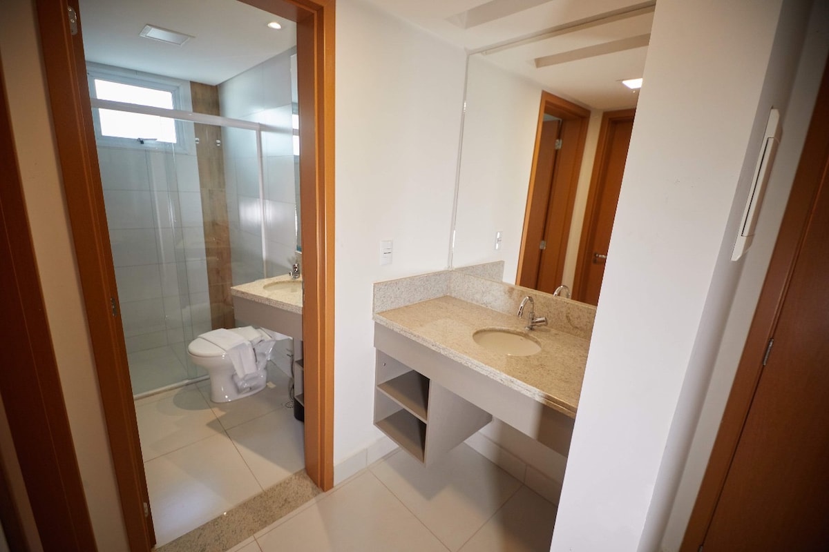 Accogliente appartamento in un condominio completo, con 5 piscine termali, sauna e vasca idromassaggio, bar ristorante, reception 24 ore su 24. L'appartamento dispone, tra le altre cose, di smart TV in soggiorno e camera da letto, aria condizionata portatile da 12000 BTU, asciugacapelli, Wi-Fi da 600 Mbps fornito da Claro, cucina completa e amaca sul balcone. Posto auto coperto ed esclusivo di fronte agli ascensori e ottima posizione a Caldas Novas. A circa 300 metri dallo shopping di Singapore!