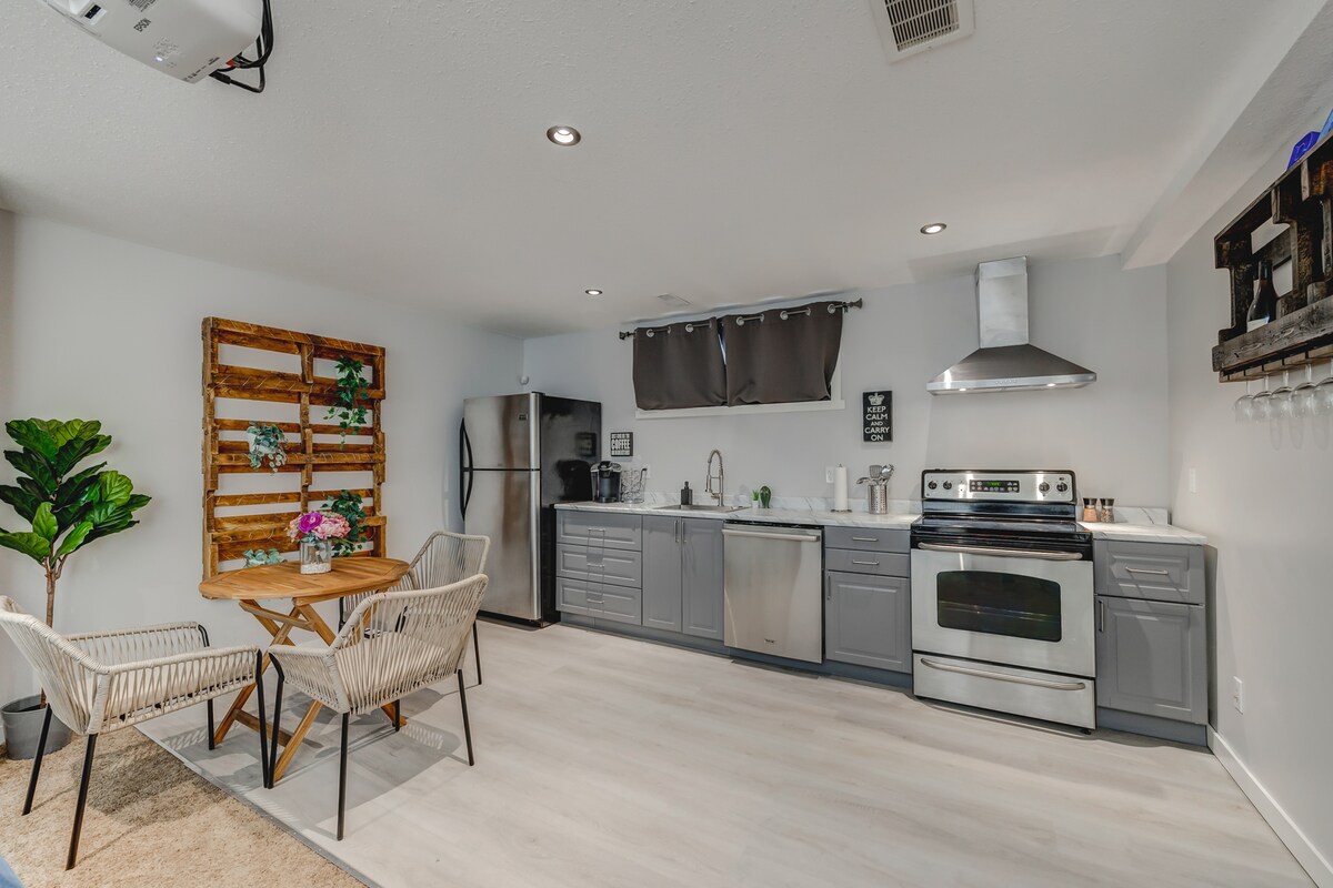 Spaziosa casa con 3 camere da letto a pochi passi dalla 17th Avenue con due suite principali, bagni ispirati alle spa e TV in entrambe. Home theater con macchina per popcorn! Goditi un patio privato con barbecue, una cucina open space con posti a sedere sull'isola e un home theater personalizzato con schermo da 150", angolo bar e macchina per popcorn. Ideale per famiglie, professionisti e soggiorni più lunghi. Posizione raggiungibile a piedi vicino a parchi, negozi e LRT. Aria condizionata centralizzata, tocchi premurosi e spazi flessibili rendono facile ambientarsi e sentirsi a casa.