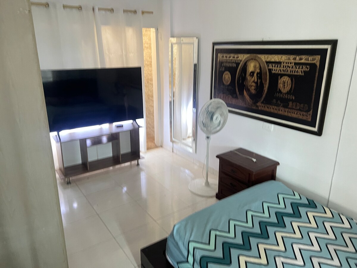 Enjoy the city in this centrally located accommodation. Close to main avenues and shopping centers, Smartfit Gym two blocks away, supermarket, restaurants, a bakery on the corner, Enjoy a cool and very welcoming space. Ideal for a weekend getaway, a business trip, or a full month to be close to the festivities during the Cali Fair. We also offer Wi-Fi, a washing machine, (no additional payment) a Smart TV with Netflix already installed, a fully equipped kitchen, refrigerator, and a fan.