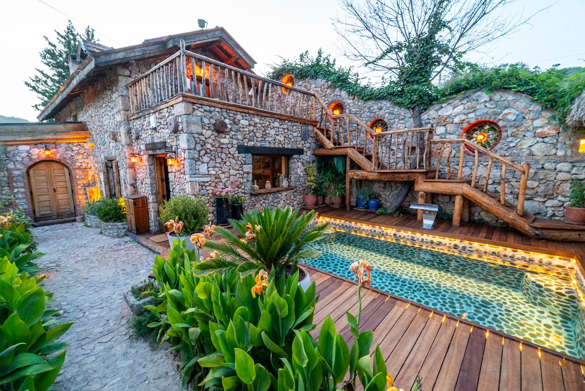 L'armoniosa villa per le vacanze in pietra e legno appositamente progettata vanta una valle unica di farfalle, viste sul mare e sulla natura. Un caminetto con vasca idromassaggio, adatto per escursioni sulla storica strada di Ikya, ti aspetta per goderti il tramonto, dove ti piacerà guardare il tramonto, che sarà a disposizione dell'ospite Sauna di un'ora $10 supplemento La piscina è salata, a uso gratuito Riscaldamento della piscina Costo aggiuntivo di 60$ al giorno la piscina può essere accesa con vetro e riscaldamento laterale chiuso (27-29) gradi 2 giorni prima dell'approvazione