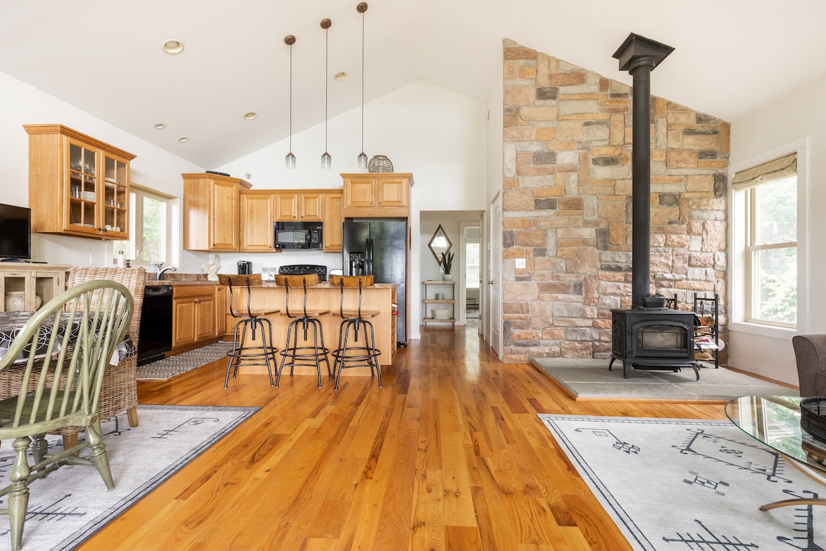 Rifugiati in campagna nell'incantevole "Timber View". Circondato da cantine e bellezze paesaggistiche, questo rifugio di campagna offre una vacanza tranquilla per chi cerca di staccare la spina e rigenerarsi. Svegliati con i suoni della natura, goditi il caffè del mattino sul portico e trascorri le giornate esplorando la regione dei Finger Lakes con attività come escursioni, visite ai mercati degli agricoltori locali o semplicemente godendoti la tranquillità della vita rurale. La sera, riunisciti attorno al focolare per ascoltare storie e osservare le stelle.