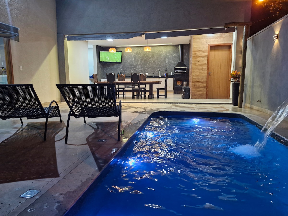 Hospede-se com toda a família e amigos nesta acomodação espaçosa e estilosa com ótima localização, vista panorâmica e estrutura para que sua estadia seja memorável. A 150m de supermercado, farmácia e zona comercial, a casa conta com duas salas de estar, dois banheiros, dois sofás-cama, refrigerador, freezer, cafeteira, sacada, copa, cozinha, lavanderia e churrasqueira portátil.