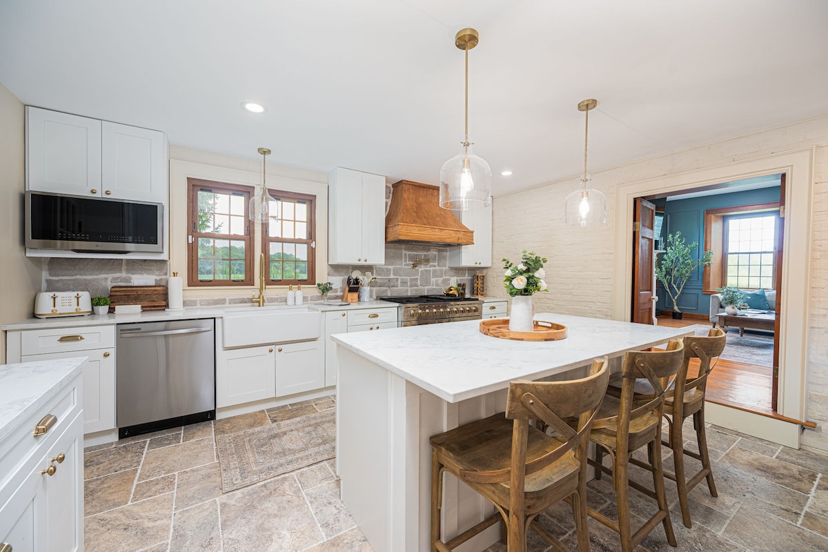 Bellawood Farmhouse is a one of a kind Agritourism experience! This 1800’s French Country brick home is nestled on 82 acres of beautiful active farmland. The updated chef’s kitchen is equipped with a 48”, 6 burner gas range, double ovens, a pot filler and 7’ custom fridge. The large island, buffet and dining table make this home perfect for large gatherings! Outside you will find a secluded in ground pool, out door dining, lounge area and outdoor bar and grill designed for entertaining.