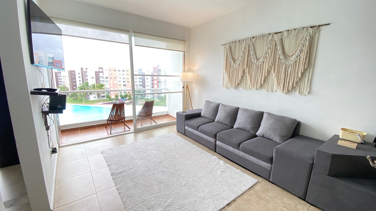 Apartamento hermoso, limpio y exclusivo para cada grupo de hospedaje. BalcĂłn, terraza, 3 recĂĄmaras. 2 baños. Con vista espectacular a la laguna (artificial), 7 albercas, jardines. Seguridad 24/7. Estacionamiento, Wi Fi, Aire Acondicionado, Ventiladores, 2 Smart T.V. , Netflix, Lavadora, secadora, plancha, secador de pelo, Caja de seguridad, etc. Supermercado, Tiendas de conveniencia, CafeterĂas, gasolinera, restaurantes y bares, servicio de Emergencias, ATM, a 3 cuadras del Complejo.