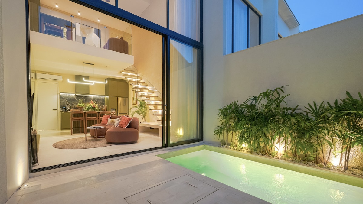 *Solo adulti* Non adatto ai bambini Situato su due lussuosi livelli di moderno design contemporaneo, l'unicità del loft non ha rivali. Con elementi in cemento e lussureggianti caratteristiche in legno color miele, l'alloggio offre un senso assoluto di calore e opulenza. Il livello inferiore consente di aprire le ampie porte scorrevoli dal pavimento al soffitto, creando un flusso continuo dalla zona giorno principale e invitando il cortile tropicale appartato e la piscina a diventare un tutt'uno.
