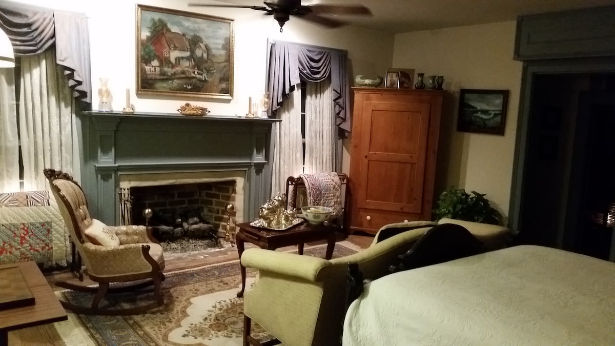 Un rifugio davvero rilassante! Offriamo una suite di due camere al primo piano che include una grande camera da letto con letto king size e un ampio bagno con vasca da bagno con piedini, doccia separata e spogliatoio con doppio lavabo. Una terrazza privata si affaccia sul pascolo. A disposizione anche uno studio adiacente con TV e divano letto estraibile. L'alloggio fa parte di un allevamento di pecore funzionante, situato in posizione strategica tra New Bern e Kinston, in North Carolina, entrambe a 15-20 minuti di distanza.