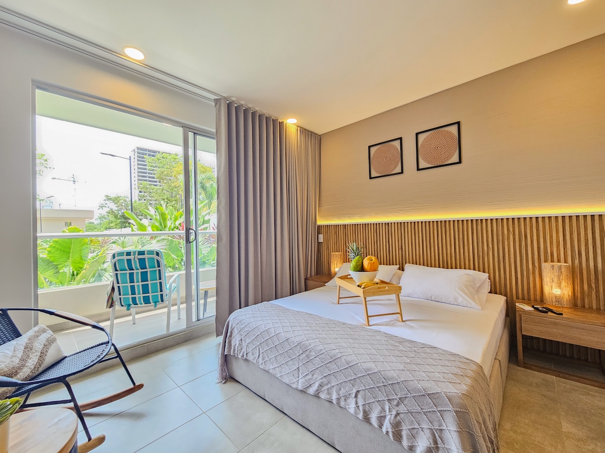 In questo appartamento sull'oceano, tutto è stato pensato con cura: i tappeti provengono dal mercato di Montería e profumano ancora di palma secca; le lampade in vimini pendono come soli domestici, e sul balcone, l'artigianato locale racconta storie al vento. Ci sono remi sul letto, come se il sogno fosse un viaggio, e cioccolatini nascosti, perché ogni casa deve avere dolci segreti. È un rifugio per anime sensibili, che sanno guardare Santa Marta con gli occhi dell'arte e un cuore sereno.