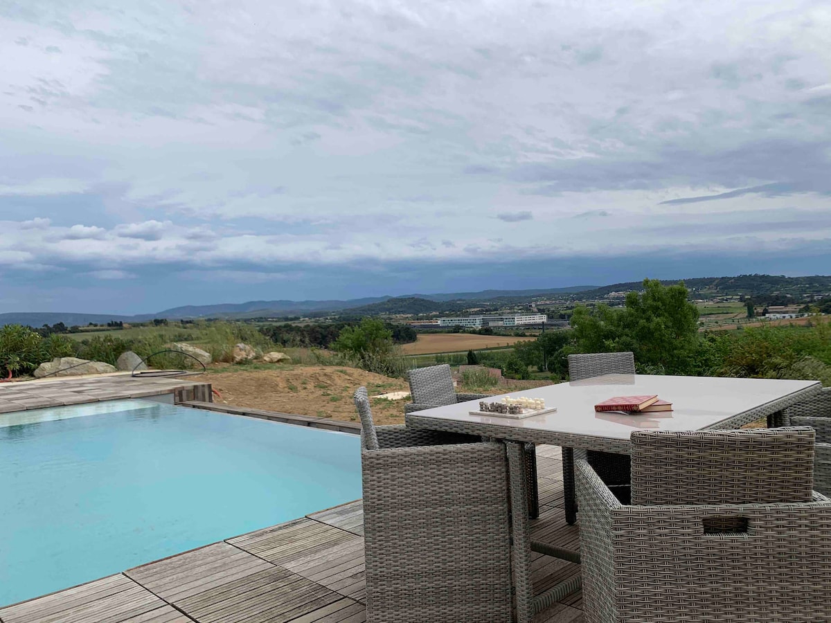 Buongiorno, siamo lieti di ospitarvi in una parte separata della nostra casa In un vicolo cieco, una splendida vista degna di una cartolina, la città medievale e i Pirenei. In famiglia o con gli amici venite a scoprire la nostra casa. -una cucina attrezzata con tutto il necessario per preparare buoni piatti. -3 grandi e comodi divani letto nel soggiorno di 40mq -2 suite matrimoniali con bagno, cabina doccia e spogliatoio - Piscina riscaldata a sfioro.