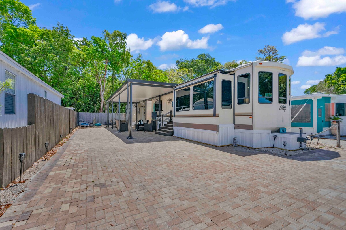 Questo gioiello nascosto è tutt'altro che ordinario! Vieni a goderti un pezzo di paradiso a Key Largo mentre ti rilassi in questo spazioso camper di lusso NUOVO. Dispone di una RAMPA PER BARCHE, cucina interna/esterna con TV, altoparlanti esterni, 2 amache, divano esterno, zona pranzo esterna, camere da letto separate tra cui una a castello che può ospitare 5-6 persone, 1,5 bagni, 2 piscine riscaldate, 2 spiagge, campo da pallavolo, parco giochi e shuffleboard. Ci sono così tante attività all'aperto di cui godere proprio al Kampground, che non vorrai più andartene!