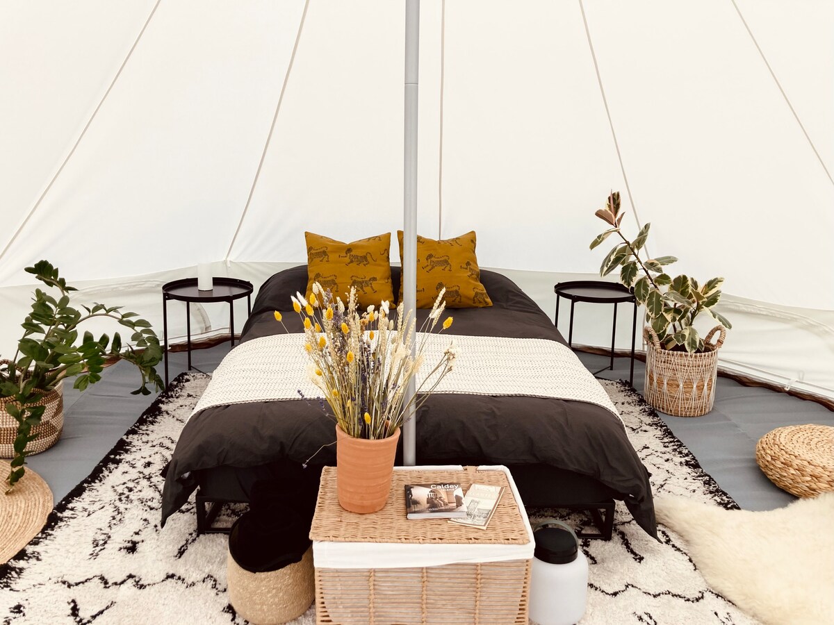 Una spaziosa tenda a campana di 5 metri con splendida vista sul mare, che si affaccia sulla splendida isola di Caldey e sulla sua pittoresca costa. All'interno troverai un accogliente letto matrimoniale con un materasso in memory foam molto profondo e una lussuosa biancheria da letto in piuma. Forniamo soffici asciugamani da bagno e morbidi lenzuola in cotone per il tuo comfort. All'esterno, goditi la tua area salotto privata e un focolare/barbecue Kadia per un'esperienza all'aperto perfetta.