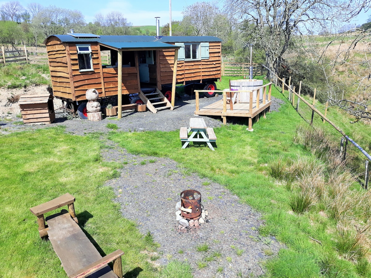 Una lussuosa, unica e stravagante capanna di pastori costruita a mano, con una vasca idromassaggio in legno alimentata a molla e una doccia rustica con bagno privato e servizi igienici compostanti. Situato nel suo piccolo angolo di una brughiera selvaggia nel Galles centrale per dare alle coppie la possibilità di staccare la spina, rilassarsi e rilassarsi Dispone di un letto matrimoniale completo di materasso memory foam a 1000 molle, luci a energia solare e punto di ricarica USB. La zona cucina ha un barbecue a gas con piano cottura laterale, lavandino e scolapiatti con lavandino e acqua calda, e viste magiche!