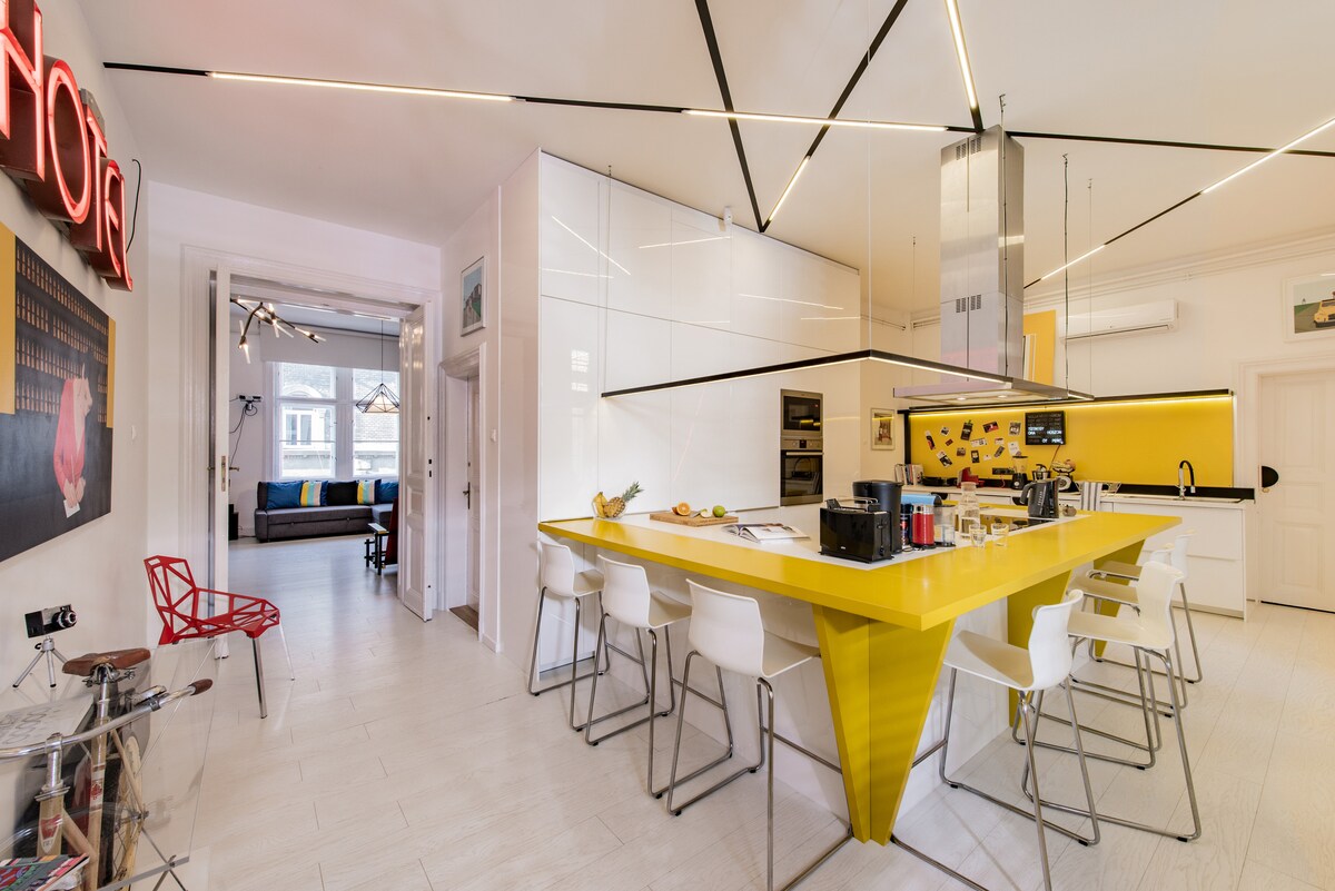 Spazio unico con tre camere da letto, grande cucina e zona pranzo. Abbiamo due bagni, uno dei quali è collegato alla camera da letto principale. Quando entri, arrivi nella zona pranzo della cucina. Da qui si può andare al soggiorno principale, dove si trovano la speciale stanza della roulotte e un flipper funzionante. La roulotte è collegata a una normale camera da letto, che offre ampio spazio privato. La camera singola si trova tra la camera matrimoniale e il soggiorno. L'appartamento è così spazioso che offre abbastanza spazio privato per ogni membro del tuo gruppo. La zona pranzo è perfetta per stare insieme in un'esperienza all'avanguardia. La casa è un tipico appartamento Pest a tre piani, e ci troviamo all'ultimo piano, il che ci permette di avere più luce. Gli ospiti hanno accesso completo all'appartamento di 120 m². Accogliamo gli ospiti di persona e durante tutto il loro soggiorno siamo disponibili tramite l'applicazione di Airbnb o per telefono. L'appartamento si trova in una tranquilla via del 7° distretto della città, che ospita il famoso quartiere ebraico e i ruin bar. La strada Nagykorut di Budapest e il tram centrale distano due isolati. Spostarsi è comodo: tutte le principali attrazioni di Budapest sono raggiungibili a piedi in 5-15 minuti. I mezzi pubblici sono eccellenti e accessibili proprio dietro l'angolo. Il parcheggio in strada costa circa 1 EUR all'ora; di solito ci sono posti liberi di fronte al nostro edificio. A un isolato di distanza c'è un parcheggio dove i prezzi sono simili, ma chiude alle 22:00 e apre alle 6:00. Ci troviamo al 3° piano e l'edificio non dispone di ascensore. La scala è ampia e non ripida.