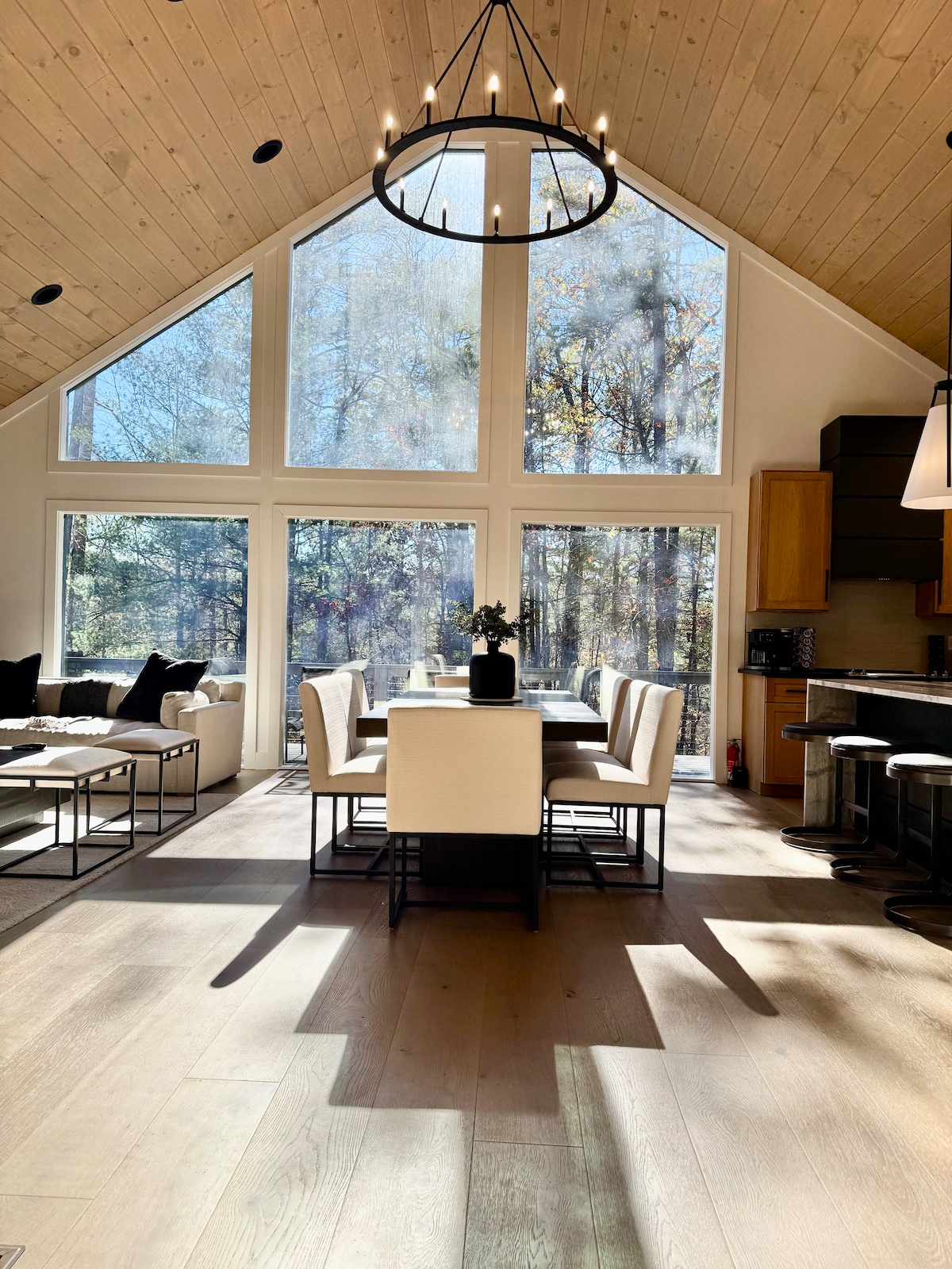 Enjoy lake and mountain views in this updated oasis amongst the trees. Whether you're looking for an outdoor adventure or a rejuvenating escape, we have it all! Situated on a five acre lake, enjoy the private dock and use of our two paddle boards and canoe. After a day of hiking, decompress in the hot tub and sauna. Tons of space to gather both indoors and outdoors, we hope you'll enjoy all the modern amenities while reconnecting with nature. Just 12 minutes to downtown Ellijay!