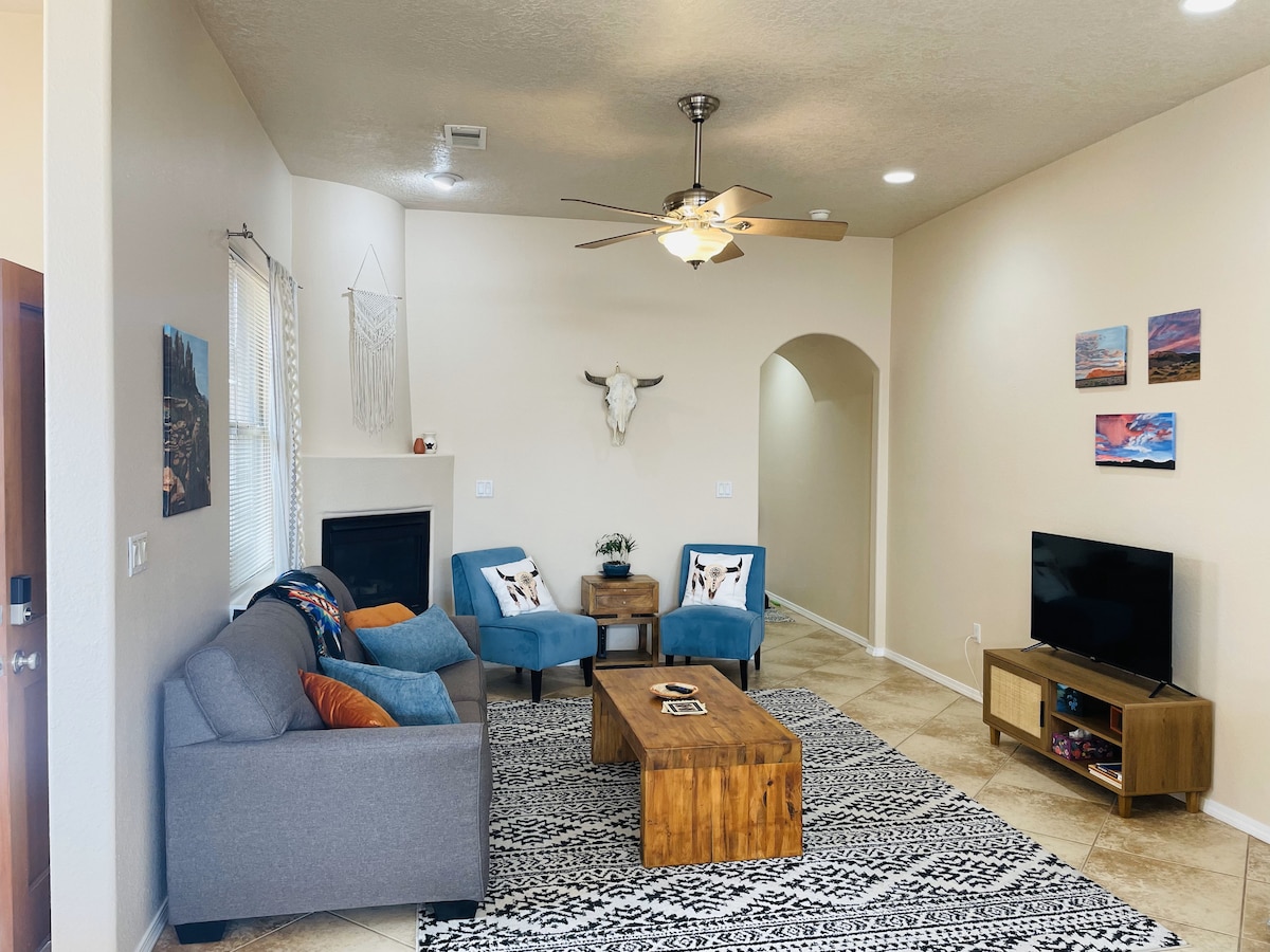 Kick back and relax in this calm, stylish space. Our cozy house is located in a very centralized area of Albuquerque which has a variety of possibilities, like coffee shops, pubs, malls, restaurants, hospitals, wellness centers, and beautiful parks. Guest access Entire house with three bedrooms and two bathrooms. One queen bed, a full bed, and another full bed. Office spaces in two of the rooms. High speed wifi with Netflix, Hulu, prime video, and a ps5. With an oasis of a backyard.