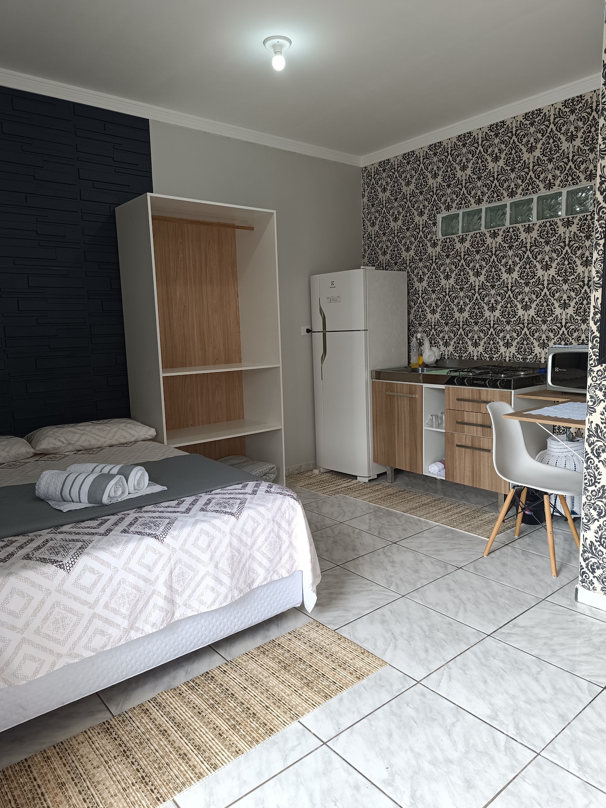Camera per due persone con: -Aria condizionata split con aria calda e fredda -TV slim con accesso a Internet; -Bagno con doccia calda; -Tavolo con due sedie; -Cucina attrezzata con pentole, posate, fornelli, strofinacci e così via; -Garage coperto e accesso con controllo; -Frigo bar; - Edificio con solo un anno di costruzione; *Mercato - 650m *Farmacia - 550m *Panificio - 500 metri *Shopping - 1,7 km *Diversi ristoranti a breve distanza.
