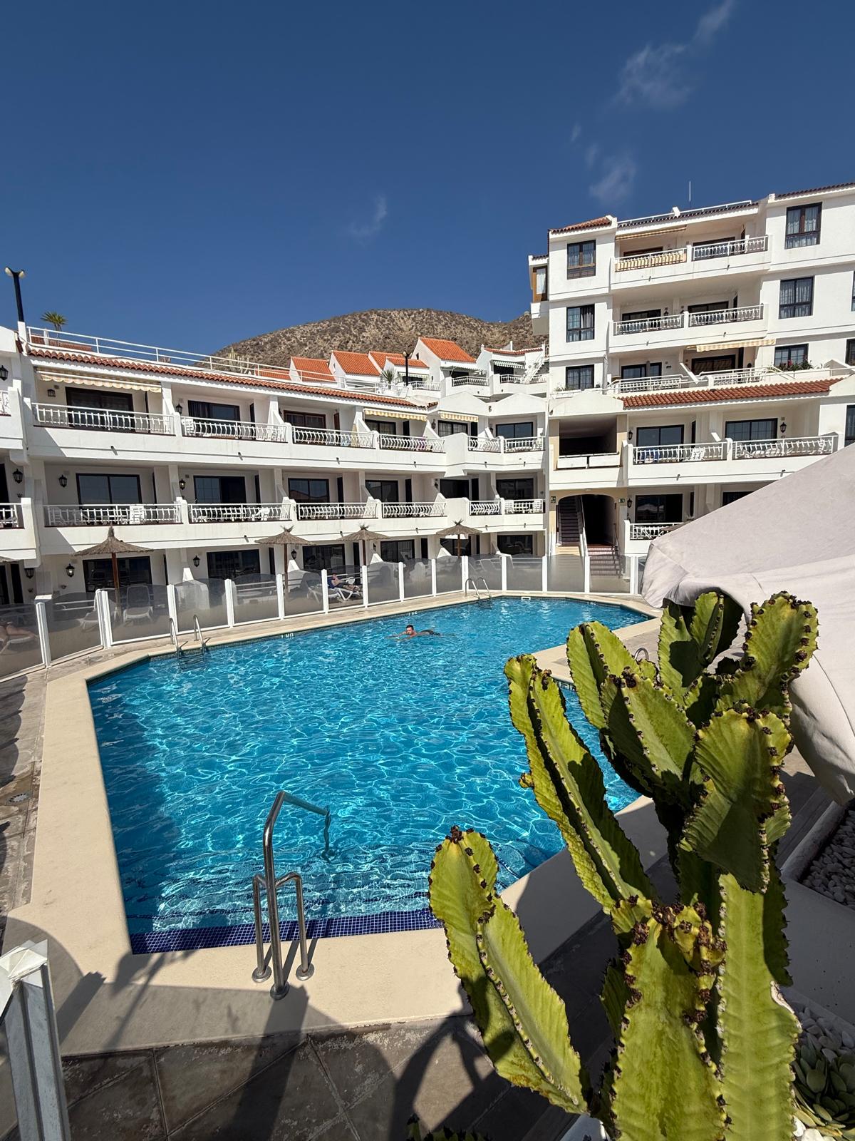 Ask me for special price! Cozy flat with pool view. Located just 3 minutes from the sea. Close to Las Vistas and Los Tarajales beaches. It has a big swimming pool with free sun lounge. Supermarket open daily and pharmacy 50 mtrs. Only 10 minutes from bus stop and 15 km from Tenerife Sur airport. The flat has a living room, equipped kitchen, bathroom, washing machine, bedroom, terrace and Wi-Fi. Nice for two people traveling alone.
