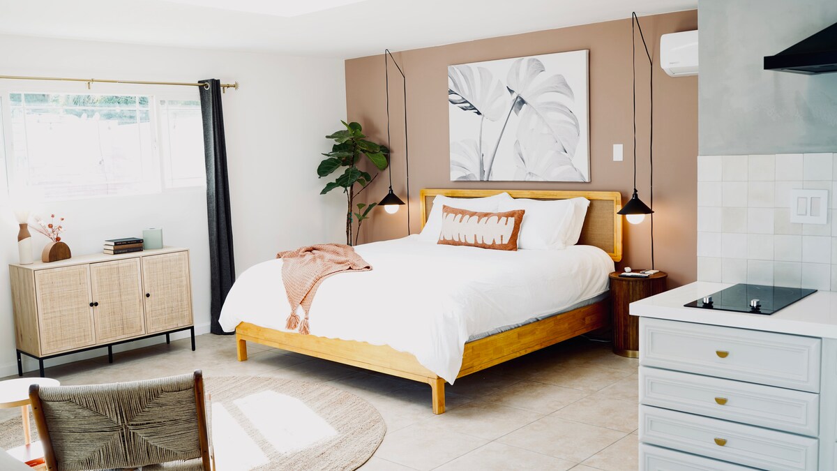 Licenza n. 015827, massimo 2 persone, massimo 1 veicolo Bellissima casita moderna di 30 metri quadrati di metà secolo, con soffitto a volta, ingresso privato, parcheggio privato, letto king-size e bagno privato. Finestre a tutta altezza che si affacciano sulla piscina, sulla spa, sulla capanna, sul tavolo del fuoco e sul giardino ben curato. Aria condizionata/riscaldamento, SmartTV a schermo piatto da 42", Wi-Fi, biancheria di qualità lavata a secco, tavolo da pranzo/lavoro, ampio spazio per riporre vestiti e bagagli. Cucinotto ben fornito/mini-frigo ti aspettano. Distanza in Uber dalle navette dell'April Music Festival.