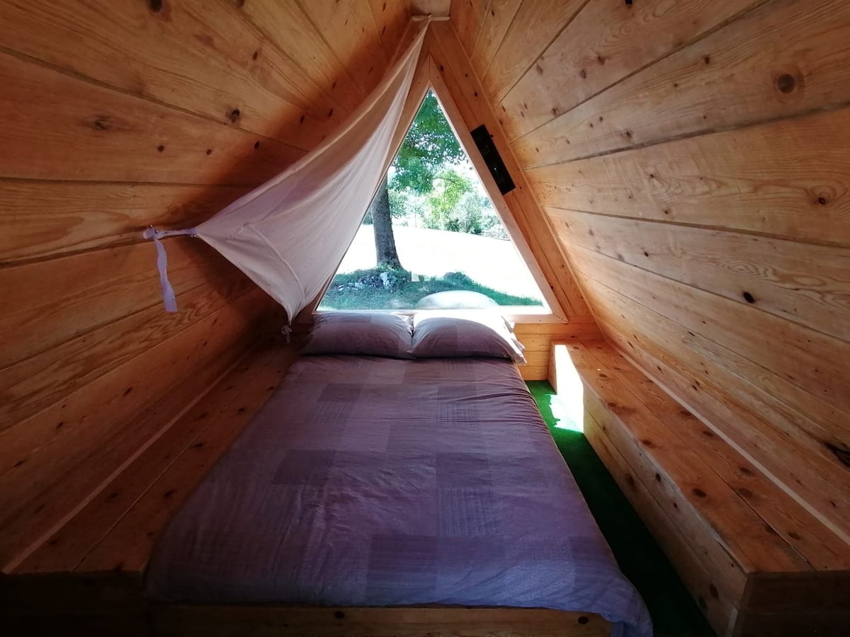 Questa piccola casa in legno è composta da camera da letto, angolo cottura attrezzato, soggiorno, soppalco e bagno. Si trova in cima alla collina, circondata da una splendida natura, in un luogo tranquillo senza traffico e con splendide viste su campi e montagne. Al mattino si sente solo il canto degli uccelli e si può godere dell'ombra degli alberi che circondano la casa tutto il giorno.