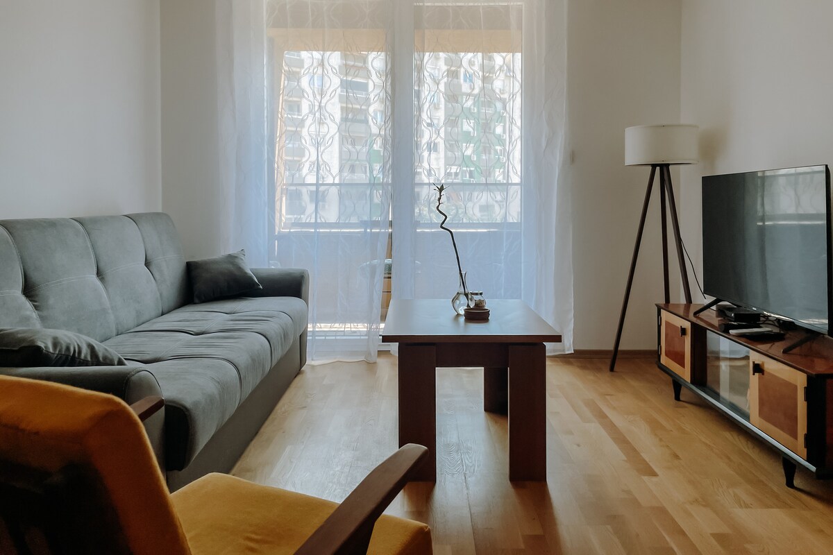 Modern one bedroom apartment with balcony, fast Wi-Fi, A/C and free parking. Walk to Main Square, Old Bazaar, malls, cafés and restaurants. Perfect for digital nomads and travellers - stylish, clean & peaceful stay! Sleeps 3 (queen + sofa bed), with full kitchen (oven, stove, dishwasher), bathroom (shower, washing machine, towels) and balcony. ✈️ We offer airport transfers for extra comfort (additional cost). Stay 10+ nights get one-way free, 14+ nights both ways free!
