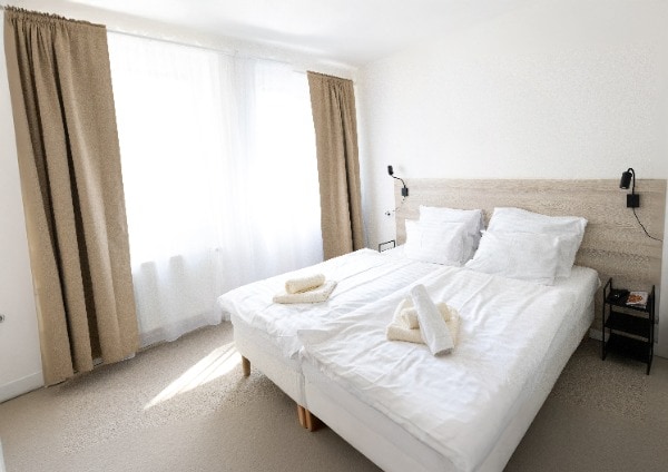 Il vantaggio di un appartamento matrimoniale è un angolo cottura completamente attrezzato con piano cottura, frigo, bollitore e set per la preparazione di tè e caffè. L'appartamento ha un letto matrimoniale, una TV, un ampio armadio e un posto a sedere. Il bagno è dotato di vasca, wc e lavandino. Asciugamani dell'hotel, cosmetici e asciugacapelli sono una cosa ovvia. Aria condizionata e connessione Wi-Fi gratuita.