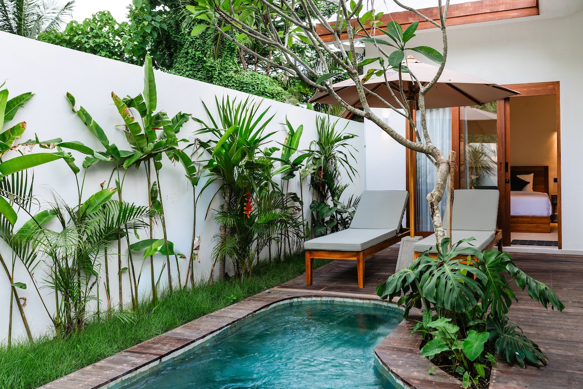 ISI ISI è un'accogliente casa a due piani con aria condizionata, piscina, cucina, ampio bagno e giardino lussureggiante, costruita con materiali naturali e circondata da palme accanto a un piccolo fiume. ISI ISI è per chi ama entrare in contatto con la natura e la vita locale. La zona è un villaggio rurale chiamato Merendeng, a 15 minuti a piedi dalla strada principale e a 5 minuti in scooter. C'è un parcheggio privato. La camera da letto offre una vista panoramica. La grande terrazza è bella per rilassarsi, fare yoga o sdraiarsi sull'amaca.