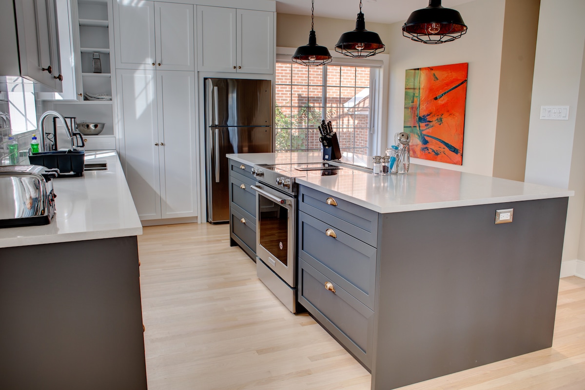 House with 3 bedrooms, 1 master suite with king bed, sitting area, bath and shower, walk-in closet, 1 bedroom with king bed, 1 bedroom with king bed and attached bathroom with bath and shower, full kitchen fully equipped, living room and dining room. Washer and dryer. Additionally, you will get a code to access the pool and gym in the next-door apartment complex. And last but not least you can bring your loyal companions to the fenced dog park we made in the nearby forest.