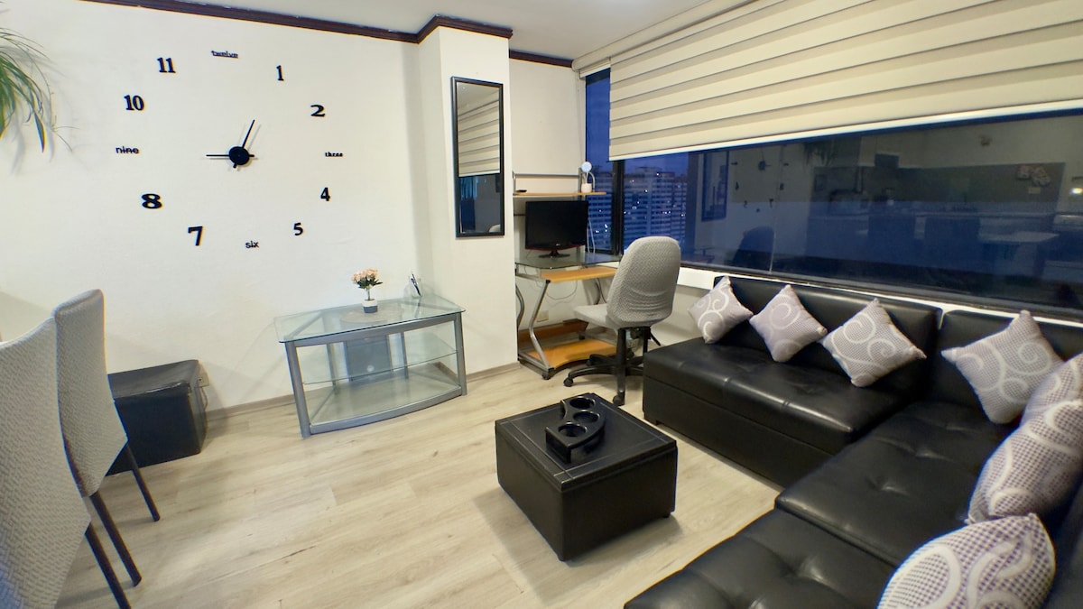 Suite by La Carolina Park, Pool & Parking Luxury suite facing La Carolina Park in one of Quito’s most exclusive areas. Enjoy stunning skyline views, modern décor, and a bright, elegant space designed for comfort. The building offers a heated pool, gym, sauna, and 24/7 security. Free parking included. Steps from top restaurants, shopping malls, and the metro. Ideal for guests seeking style, comfort, and a premium location.