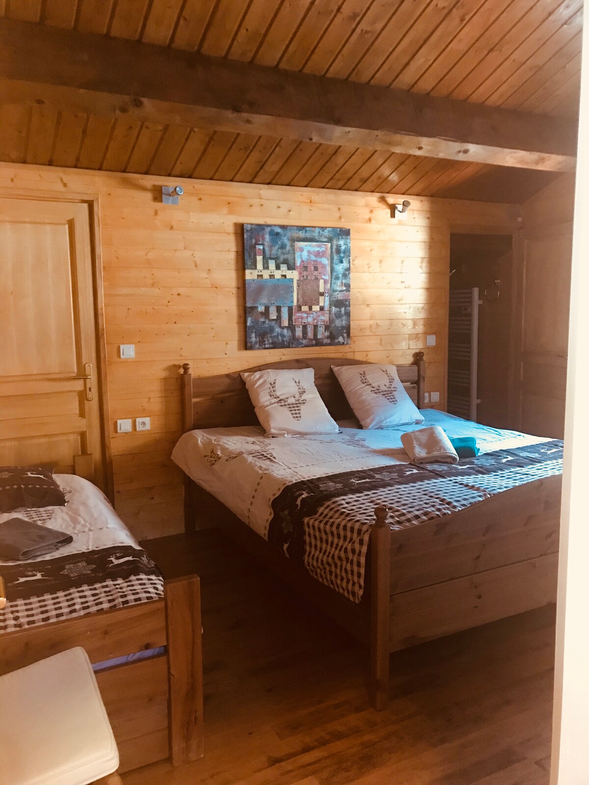2 camere con letto matrimoniale; 1 con bagno privato (doccia) e l'altro in comune. Gli ospiti ricevono la colazione e l'accesso a un soggiorno (solo per gli ospiti) con TV e computer, nonché accesso completo al giardino. Parcheggio. Anche nella stessa casa: 2 camere con letto matrimoniale e 1 con letti singoli, mostrate in aggiunte separate, ma non mescoliamo gruppi. Se prenoti una sola stanza, tutta la casa è a tua disposizione, e non ci sarà nessun altro. Le camere possono essere chiuse a chiave e, ovviamente, c'è acqua calda. L'aggiunta di Airbnb dice il contrario.