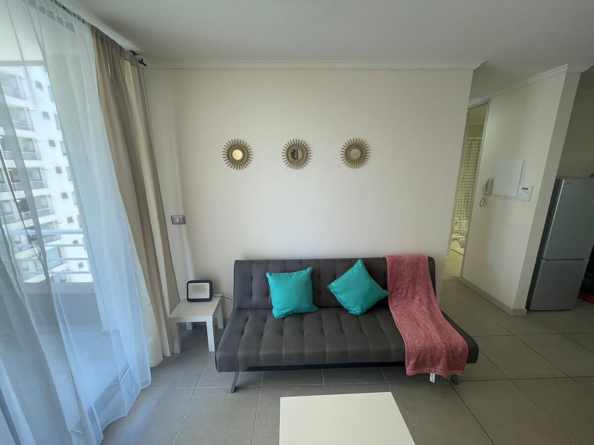 Acogedor y cómodo espacio con espectacular vista al mar! Ubicación estratégica, conexión directa hacia Viña del Mar y lo mejor de Valparaíso. Full equipado, pensado para disfrutar al máximo tu estadía. Zona para teletrabajo, con estacionamiento subterráneo, a pasos de estaciones de metro, fácil acceso a pie a todo tipo de servicios, Imperdible! No apto para niños/mascotas. (No hay cobro extra por aseo,esperamos lo regresen en las mismas condiciones.Manchas SI tendrán un recargo por limpieza).