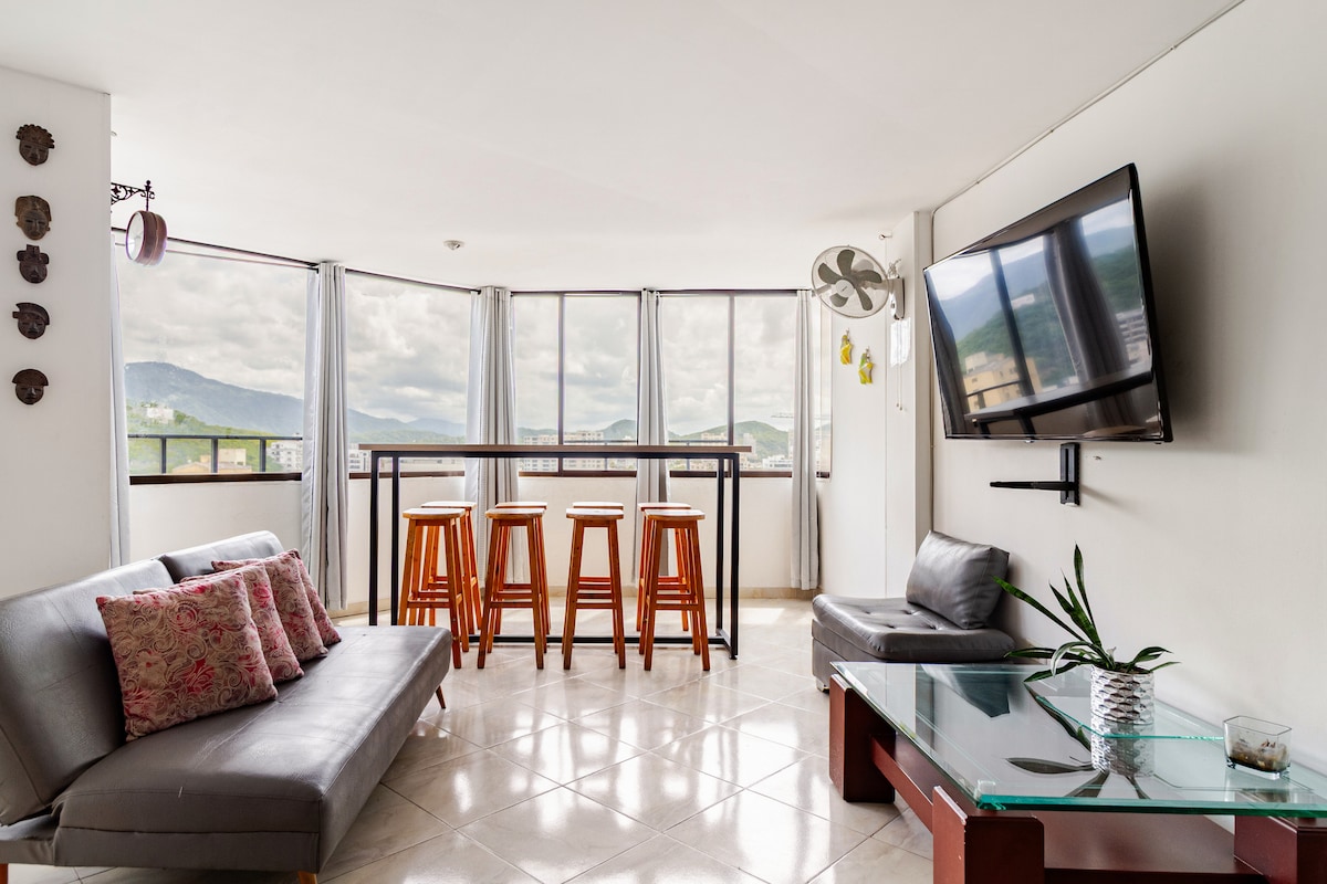 This 1 BR offers a comfortable stay with beautiful ocean views and a prime location in Santa Marta, just minutes from the Historic Center. It features a fully equipped kitchen, Smart TV, WiFi, and a private balcony with an outdoor dining area. The building includes a pool, jacuzzi, gym, sauna, steam room and 24/7 security. It's surrounded by restaurants, cafés, and nearby coworking spaces. No guests outside the reservation allowed inside the building.